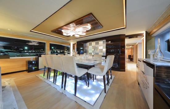ويمتد الرقي والفخامة اللذان يمكن لمسهما في غرف النوم إلى جميع أنحاء اليخت، ولا سيما الصالون الكبير الواقع على السطح الرئيسي، فثمة طاولة قهوة كبيرة تُضفي على المكان جواً مثالياً للتواصل وتبادل الأحاديث الودية في ساعات العصر والمساء.