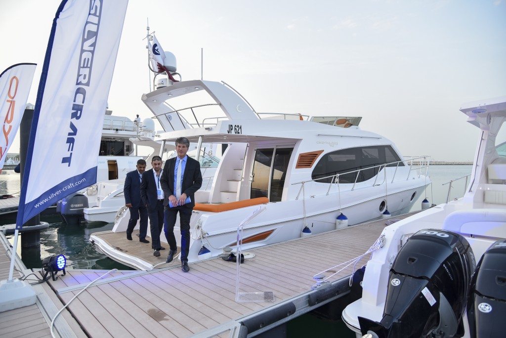 海湾游艇公司首席执行官欧文•班普斯(右)在卡塔尔国际船舶展上带领访客参观大羚羊43飞桥型游艇 海湾游艇公司首席执行官欧文•班普斯(右)在卡塔尔国际船舶展上带领访客参观大羚羊43飞桥型游艇
