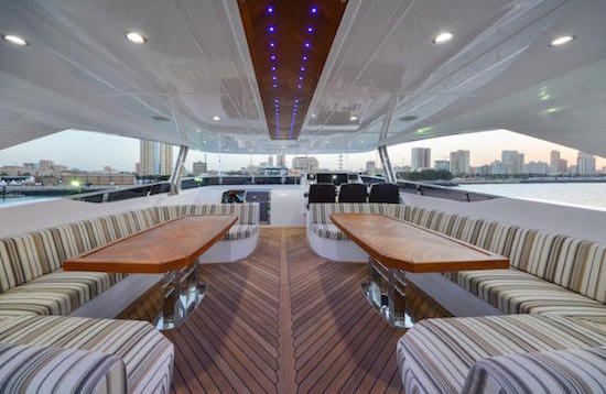 在飞桥的前端,是一个遮阳区,其专注于娱乐,社交以及创造最大化的水上生活方式。首先是一个大型的按摩浴缸,以及临近的一个配备齐全的酒吧。按摩浴缸与酒吧的位置设计可以让客人看到外部,并尽享户外的完美景色。在按摩浴缸和酒吧的前方是座椅区,有两张桌子,是享受户外用餐的另一选择。驾驶室提供了另一个遮阳的座椅区。