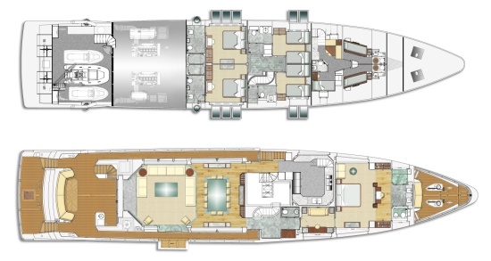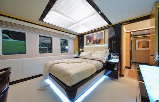 其拥有五间宽敞的船舱可容纳十名客人。首先是华丽的主人舱,位于主甲板。整体的家具以黑色调实木为主,与乳白色的长绒地毯及宽敞的大床形成了鲜明的对比。整个区域充斥着大窗户射入的自然光,创造了一种复杂丰富,且又轻松惬意的环境,让船主可以尽情放松并享受他们的隐私空间。窗边的大型舒适条纹沙发进一步延伸了放松空间,玻璃咖啡桌在其前方,对面是木制扶手椅。