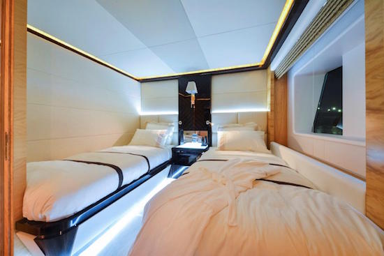 四个客舱位于游艇的下层甲板,包括两个大床VIP客舱,以及两个双床客舱。船员舱也位于游艇的下层甲板,在最前面。两个VIP客舱拥有相同的配置,包括一个大床,一张书桌,以及一个宽敞的盥洗室。在床框的下面配备了照明系统,照亮整个地板,为客人创造了一个独特体验。同主人舱一样,充满活力的艺术品贯穿了整个VIP房间,在床的正上方就一大块艺术品。这增加了复杂的设计感,同时也为房间增添了一抹亮色。