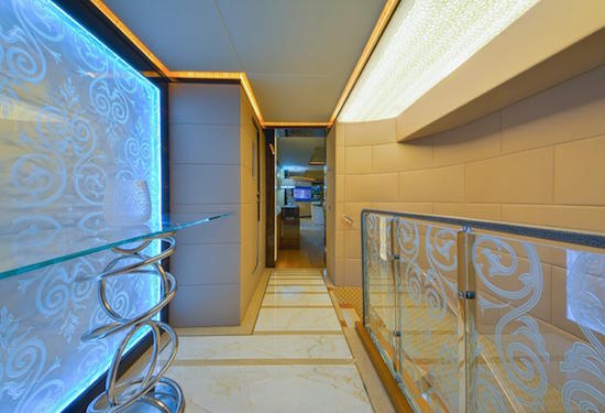 类如卧室内般复杂奢华的主题贯穿着整个游艇,在其主甲板的主客厅上,也体现的淋漓尽致,让人印象深刻。充足的空间,能够容纳足够客人的三个淡粉色沙发,以及两个独特设计的扶手椅。中间的大型咖啡桌可以为您享受下午茶,亦或是夜间社交小酌提供理想舒适环境。