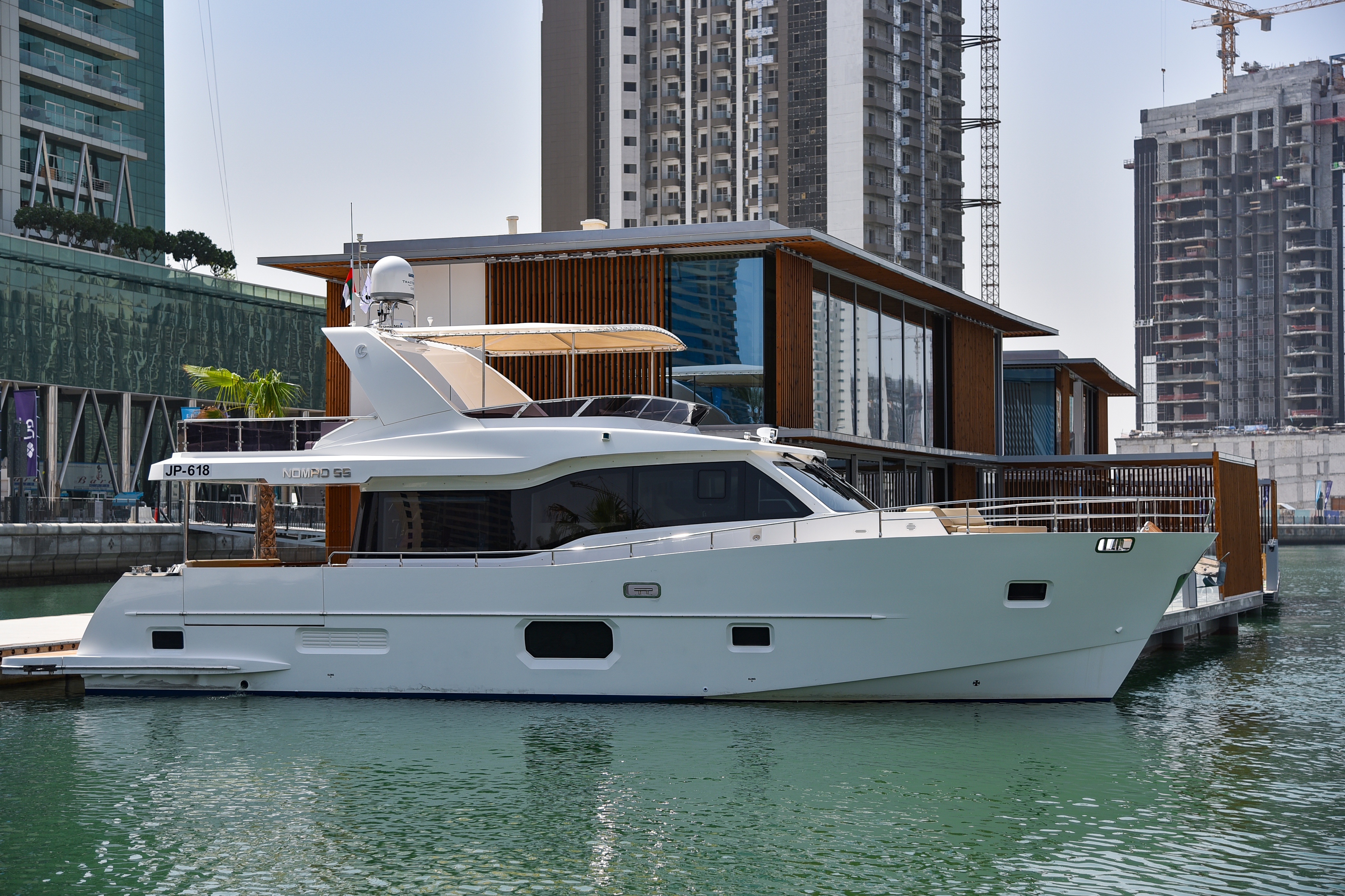 权威48型游艇停泊在马拉赛商业港的漂浮别墅旁
