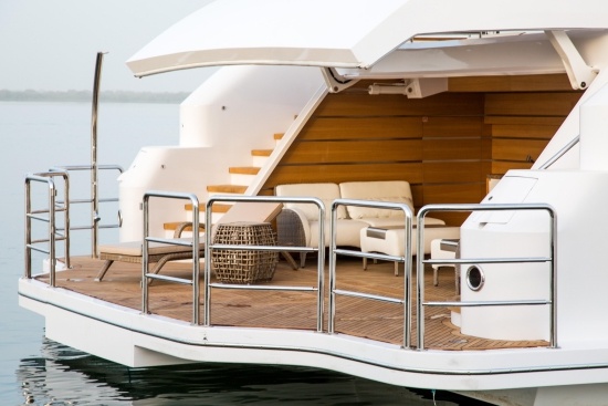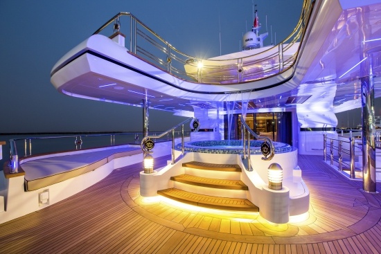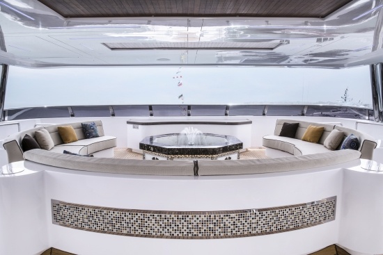 Самая крайняя хвостовая секция такой палубы без навеса и подходит для тех, кто любит проводить время на солнце. Участок балконного типа, что также является отличительной чертой Majesty 135, смотрит вниз на красивый джакуззи, вымощенный мозаикой, который расположен на мостике.