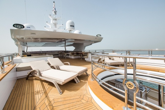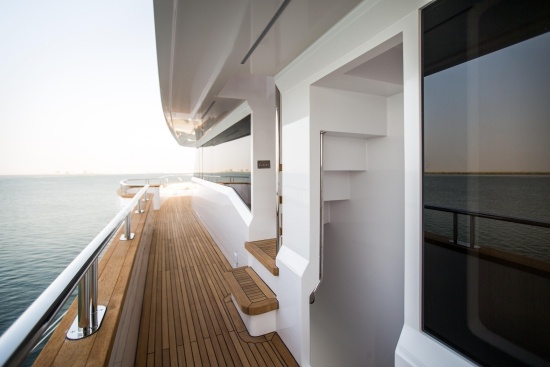 Начиная с просторной верхней прогулочной палубы, вскоре становится понятно, что такая зона создана для общения и максимального отдыха. Несколько зон для встреч, каждая из которых имеет свое предназначение, была создана таким образом, чтобы гости могли с легкостью перемещаться по палубе, не чувству себя излишне отделенными. Круглый зал переговоров был сконструирован таким образом, что из него открываются удивительные виды на горизонт, и оборудован баром и двумя обеденными/лаундж зонами в хвостовой части. Все такие зоны оборудованы навесными структурами типа жалюзи.