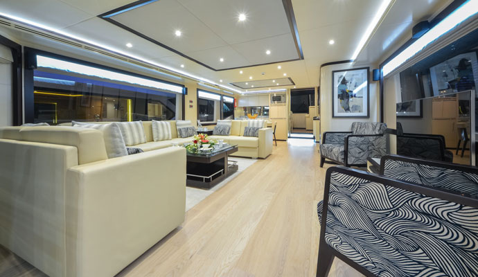 Войдя в основную каюту с кормового кокпита, глубокие окна в основной каюте Nomad 75 дают ощущение простора. Такое ощущение усиливается тем, как окна "окутывют" угла яхты, предлагая панорамный вид и чувство, что вы одни в море. Основная каюта предлагает большие количество места для развлечений и отдыха, полностью используя преимущества шестиметровой ширины яхты, и как и другие помещения, может быть персонализирована в соответствии с идеями владельца с помощью команды дизайнеров интерьера компании Gulf Craft.