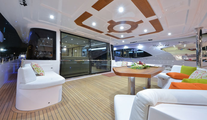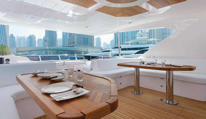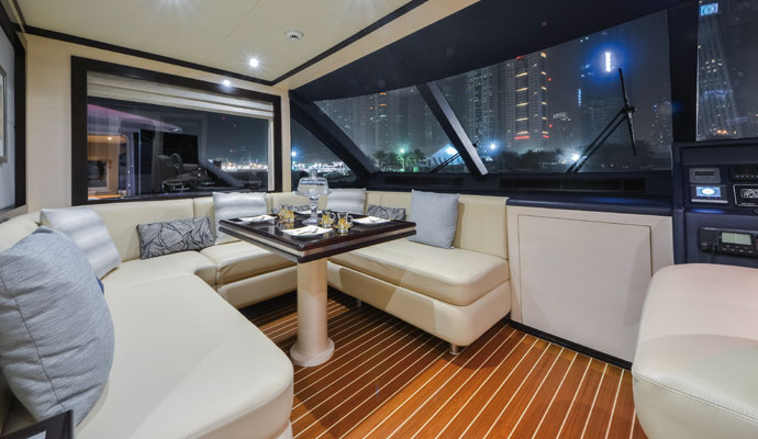 Для проведения вечеринок флайбридж может вместить 20 человек, а также здесь можно разместить барбекю и бар с напитками и холодильниками. Если владелец хочет разместить гидроцикл или надувную лодку, встроенная в флайбридж палуба укреплена для установки крана.