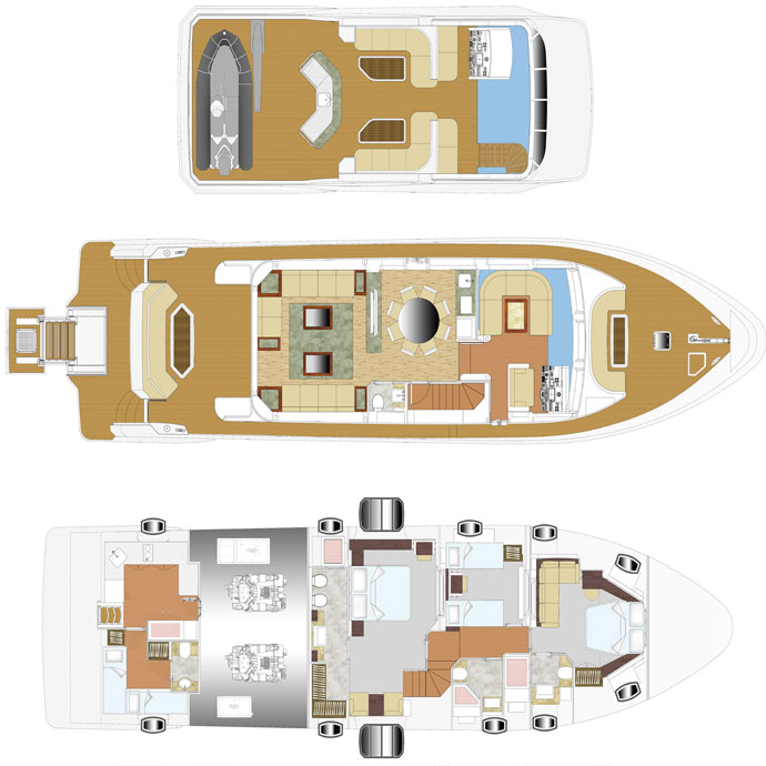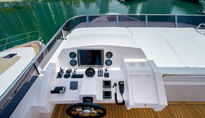 На правый борт и к передним палубам можно просто и с легкостью выйти из рулевой рубки через двери за рулевым постом. Для того, чтобы управлять яхтой смогла небольшая команда, лестница на флайбридж также находится за этой дверью, что позволяет шкиперу попасть в три ключевые зоны: флайбридж, палубу и рулевую рубку. Среди преимуществ можно выделить поручни на лестницах, обеденную зону и зону бортовой кухни, что является признаком того, что лодка была спроектирована для серьезного использования в море.
