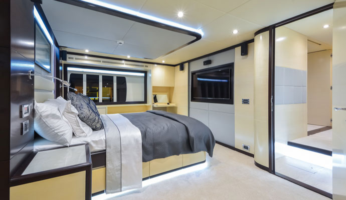Пространство в каюте является удивительной характеристикой Nomad 75, и предлагается вариант трех- или четырех-каютного расположения для дальнейшей настройки в соответствии с желаниями владельца. Пример, который мы наблюдали на международной выставке яхт в Дубае, был трех-каютной версией с двумя отдельными каютами с каютой владельца на нижней палубе с лестницей в кормовой части поста управления.