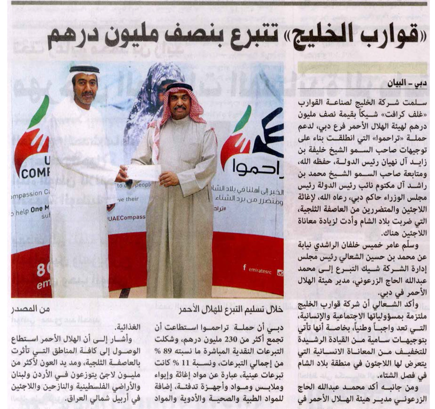 In response to the initiative of HH Sheikh Khalifa bin Zayed Al Nahyan, President of the UAE, and HH Sheikh Mohammed bin Rashid Al Maktoum, Vice-President and Prime Minister of the UAE and Ruler of Dubai, to support the "Tarahamo" campaign, Gulf Craft has donated a sum of AED 500,000 to help support thousands of Syrian refugees from the Levant region.